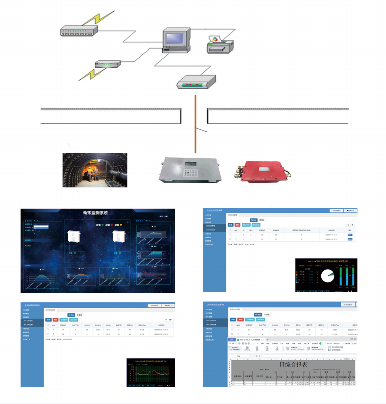井下监测主机内嵌单片机装置进行现场采集信号、实时分析,能实现分析结果就地实时显示、存储等功能,并可通过传输光缆与地面监测中心站进行通信。
