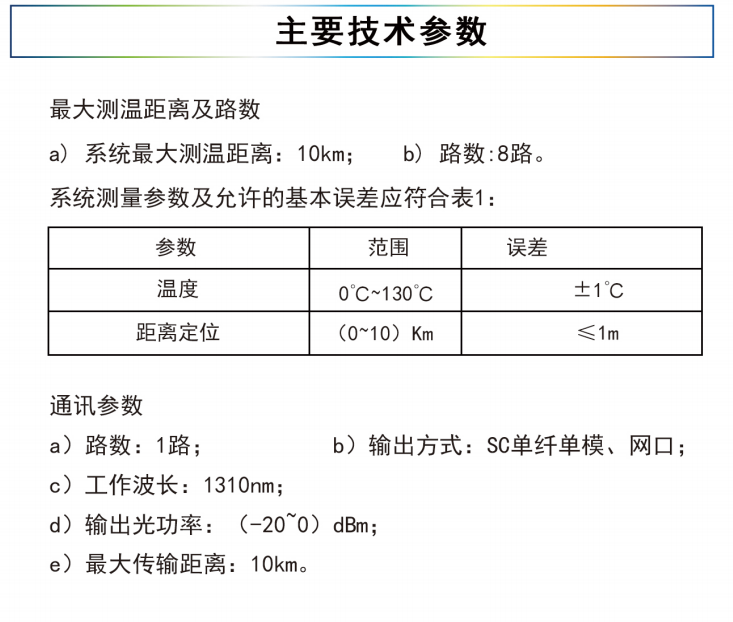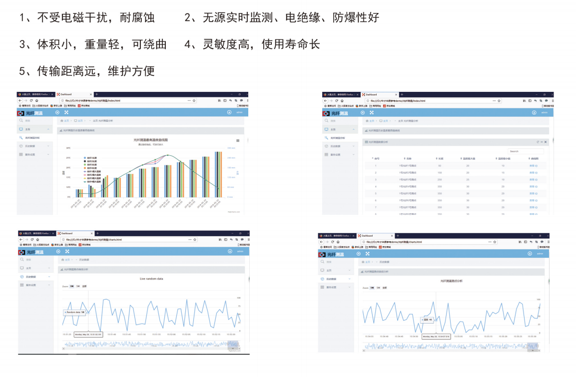 该系统可以测量一条或多条测温光纤所在区域温度场的分布,具有防燃、防爆、抗腐蚀、耐高压,测量范围广、定位精度高、使用方便等。