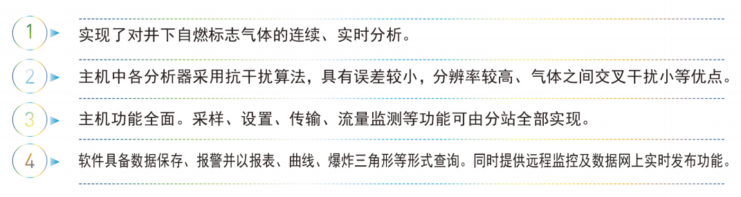 系统通过监测矿井井下取样点空气中气体浓度并根据气体变化趋势了解矿井的状况,为煤矿自然火灾和矿井瓦斯事故的防治工作提供科学管理。